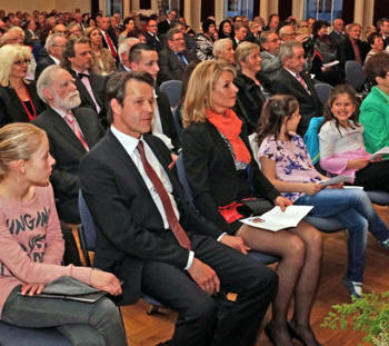 „Herr Bertsch, Sie sind ein Mensch, dessen Devise einsteigen, nicht aussteigen ist" charakterisiert Bürgermeisterin Bettina Mettler den Ehrenbürger. Aufmerksam hörten der neue Ehrenbürger Karl-Heinz Berstch und die vielen Gäste und Bürger die Grußworte der Ehrengäste. Stehend ehrte Familie und Bürgerschaft den neuen Ehrenbürger Karl-Heinz Bertsch (am Rednerpult)