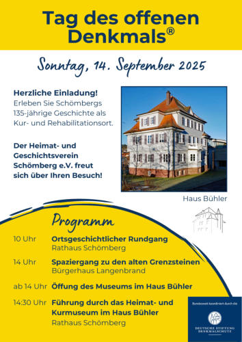 Begeben Sie sich auf eine spannende Zeitreise. Friedrich Eschwey führt Sie auf dem Kurortgeschichtlichen Rundweg durch Schömberg mit anschließendem Besuch des Heimat- und Kurmuseums Haus Bühler. Die Führung dauert etwa 2 Stunden und findetbei jedem Wetter statt. Anmeldung ist nicht erforderlich. Termine: 04.10.2025 08.11.2025 06.12.2025 jeweils 10 Uhr beim Rathaus, Lindenstraße 7